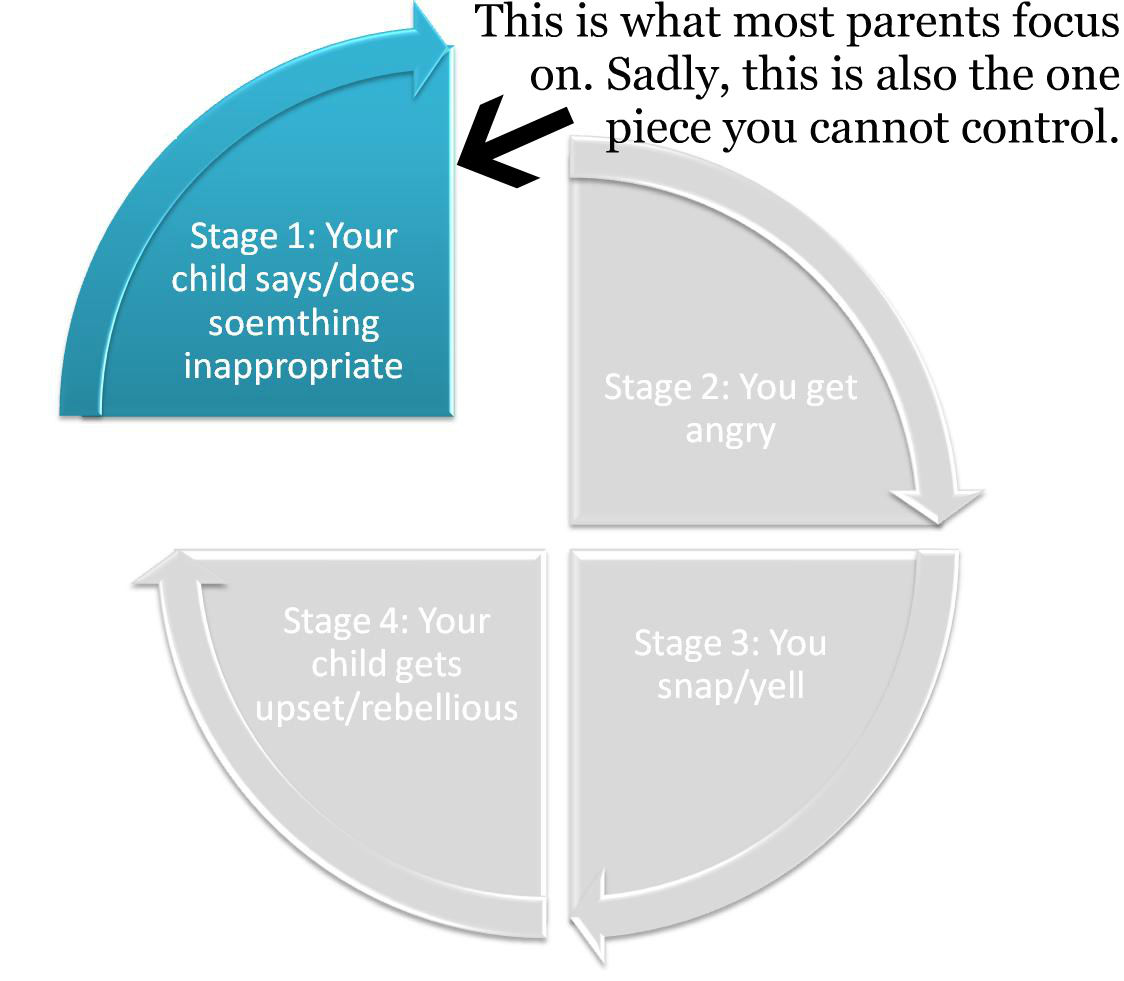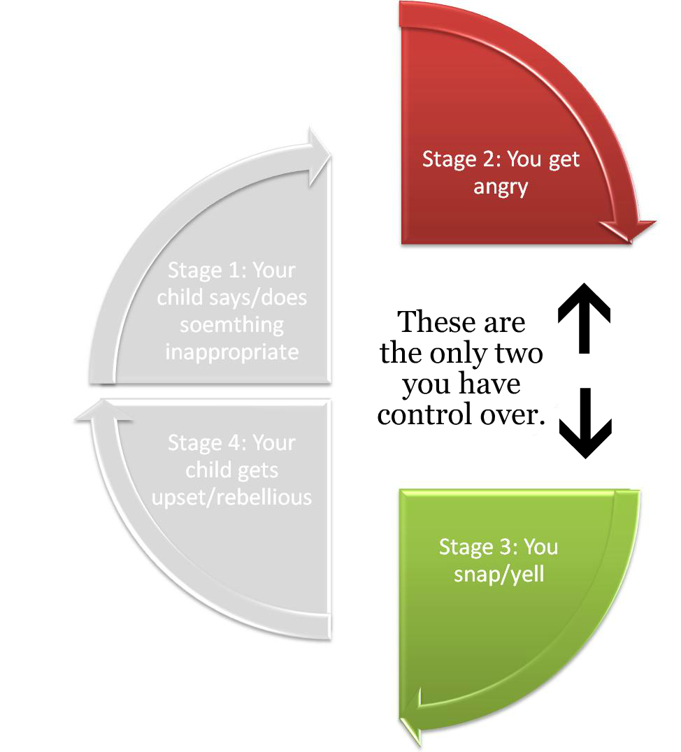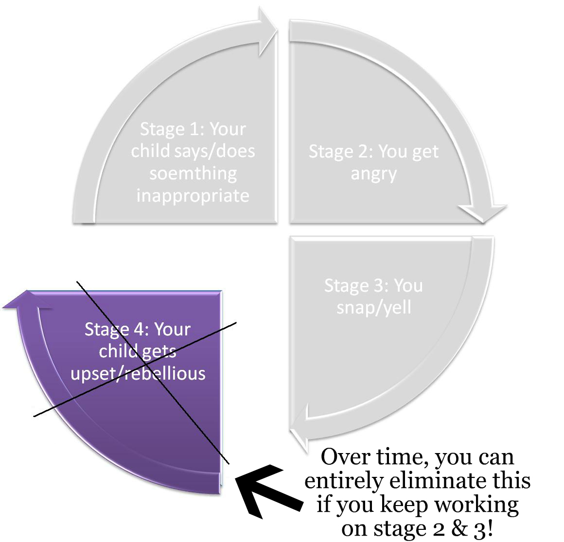 Stage 4 is essentially your child’s reaction to your own reaction to the situation. While you cannot control your child’s reaction, by modifying your own behavior in stage 3, you can eliminate the need for your child to react. Or at least reduce the negativity of the reaction so it won’t feed into the stage 1 of the next cycle.